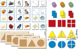 Sada obsahuje kartony se základními barvami k přiřazování a pojmenovávání, hmatové kartony s různými texturami (sametový, drsný, hladký) pro rozvoj taktilního vnímání a pole „objeví se a zmizí“ pro vkládání žetonů různých geometrických tvarů, které podporuje porozumění stálosti předmětu.