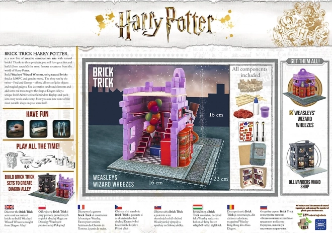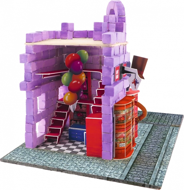 Vytvořte si doma kouzelnický koutek s barevným obchodem dvojčat Freda a George. Sada Brick Trick kombinuje skutečné materiály – mini cihličky a dřevěná prkénka – s dekoracemi, které dodají stavbě charakter. Krok za krokem postavíte budovu od základů až po hotový model a nakonec ji dozdobíte přiloženými prvky.