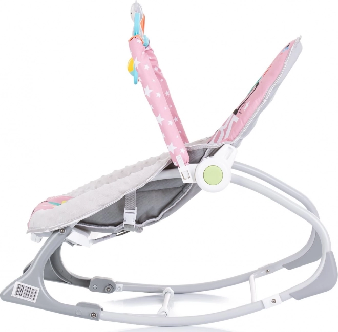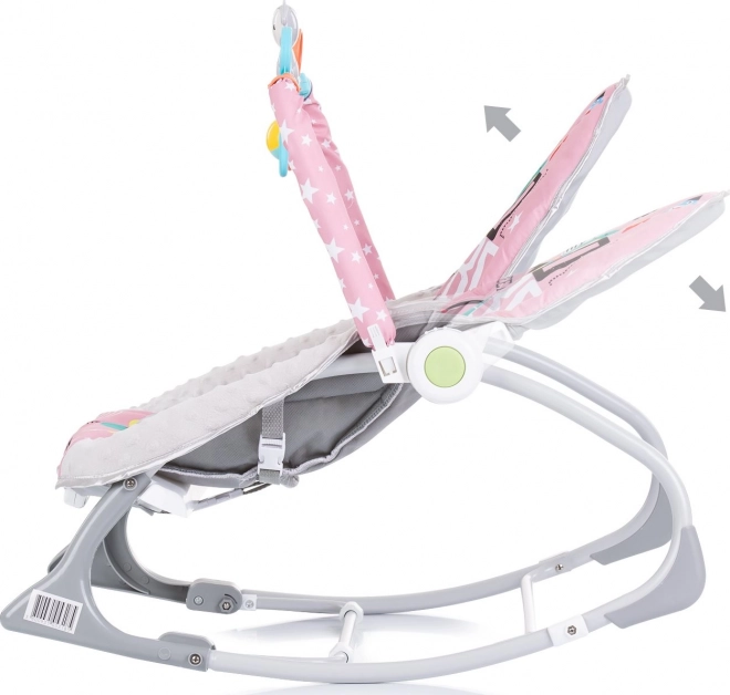 CHIPOLINO Baby Spa je praktické dětské lehátko, které roste s vaším miminkem. Díky řešení 2v1 slouží nejprve jako houpátko pro novorozence (do 9 kg), později jako židlička pro samostatně sedící děti (do 18 kg). Jemné vibrace a hudební melodie uklidní a pomohou dítěti k odpočinku, zatímco oblouk se závěsnými hračkami podpoří rozvoj zrakové a motorické koordinace.