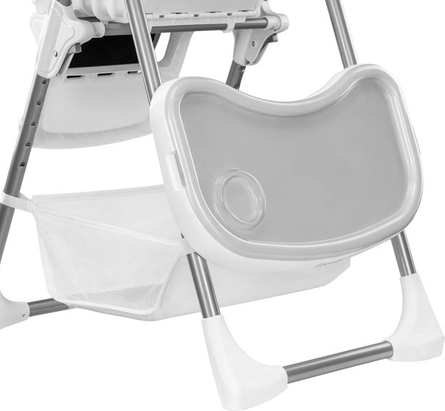 Praktické detaily každého dne: dvě odnímatelné tácky (větší na jídlo, menší jako ochrana sedáku) lze mýt v myčce. Čalounění z eko kůže stačí otřít vlhkým hadříkem. Velký koš pod sedákem pojme hračky i doplňky, kolečka usnadní přesun a protiskluzové podložky zvyšují stabilitu.