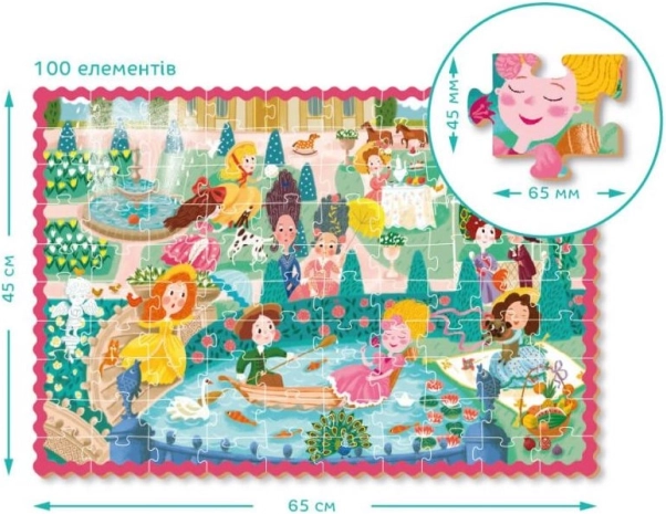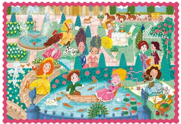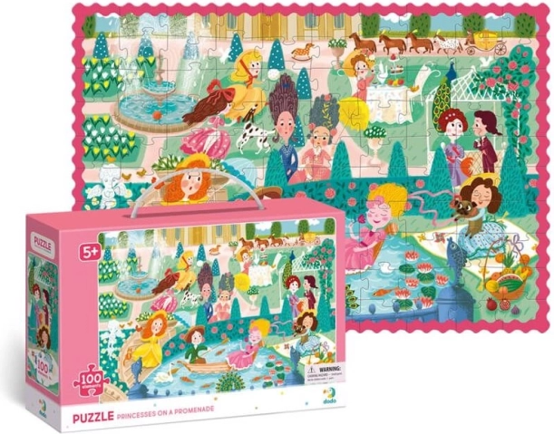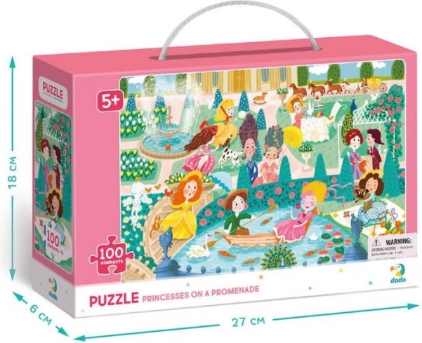 Objevte okouzlující svět princezen s dětským puzzlem DODO, které zaujme živými barvami a detailním obrázkem ze zahradní promenády. Skládání 100 dílků ve velkém formátu 65 × 45 cm je ideální pro děti od 5 let – dostatečně výzvové, ale stále zábavné.