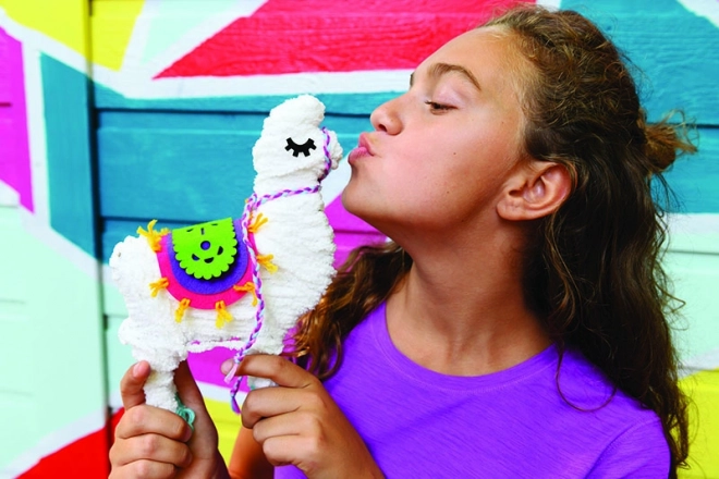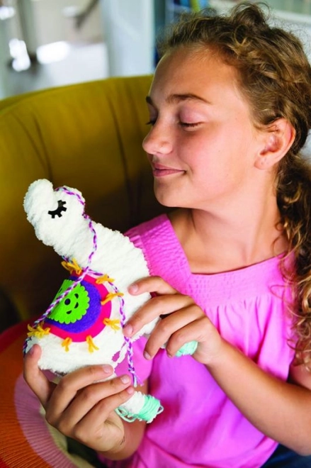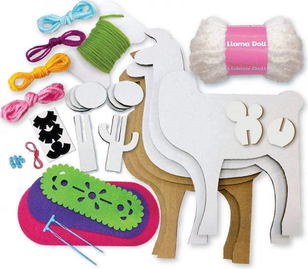 Obsahuje všechny materiály potřebné ke zhotovení lamy včetně kartonových výřezů, barevných nití a látkových kousků.
