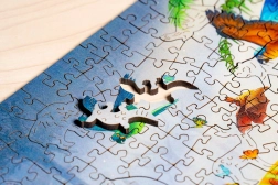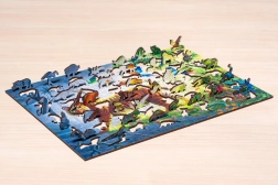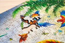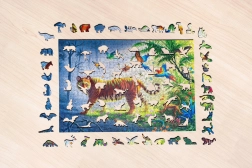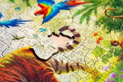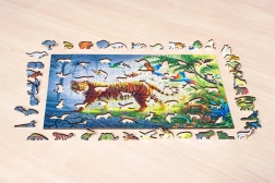 Dřevěné puzzle Tygr v džungli kombinuje precizní evropskou výrobu s okouzlujícím motivem. Každý dílek je originál – najdete mezi nimi tvary zvířat, květin i dalších předmětů, které dělají skládání ještě zábavnější a vizuálně atraktivní. Díky pevnosti materiálu a přesnému výřezu puzzle skvěle drží a opakované skládání jim neublíží.
