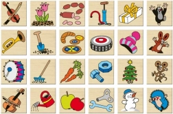Didaktická hra z dřevěných kamenů s potiskem Krtka a jeho kamarádů pomáhá dětem rozpoznávat předměty a procvičovat logické myšlení a paměť.