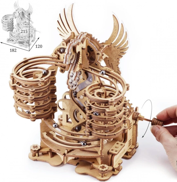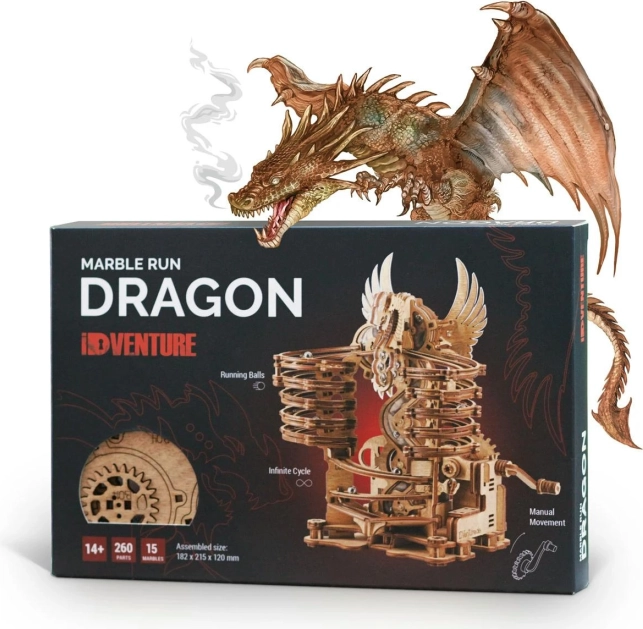 Objevte kouzlo mechaniky s propracovanou kuličkovou dráhou MARBLE RUN DRAGON od IDventure. Otočte klikou, pošlete kuličky výtahem nahoru a sledujte, jak sviští po spirálách a zakřivených kolejích. Přepínačem zvolíte dráhu, po které se kuličky vydají, a každý běh je tak jedinečný.