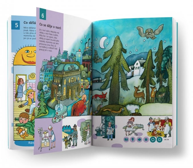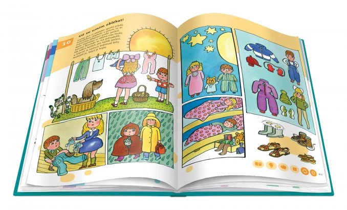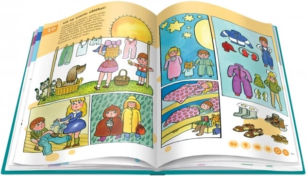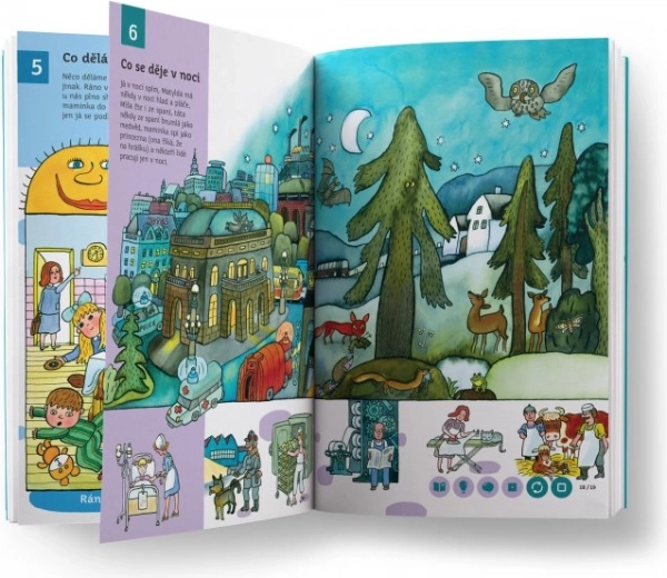 Obsah knihy je rozdělen do 58 tematických kapitol – od života ve městě a na venkově, přes přírodu, moře, zoo až po cestování do vesmíru. Děti se postupně učí abecedu, číslice, barvy, tvary a rozšiřují si slovní zásobu i všeobecný přehled. Kniha nabízí přes 11 000 zvukových stop, které namluvili Karolína Gudasová Neuvirthová, Petr Ryšavý a Michal Stejskal.