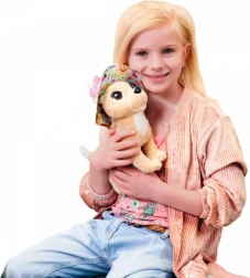 Plyšový pes Chihuahua s velkými, výraznými očima a barevným kloboukem, skvělý pro objímání.