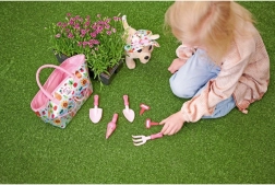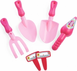 Obsahuje růžové zahradní nástroje, které jsou lehké a dětsky přívětivé, ideální pro malé zahradnické projekty.