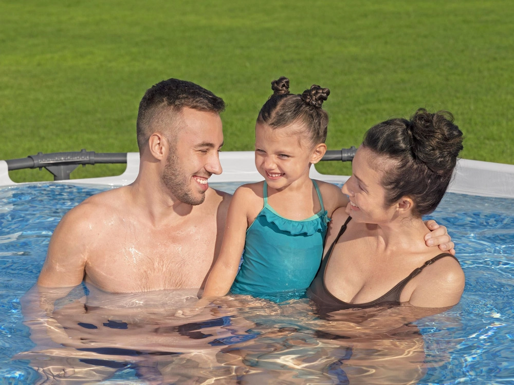 Kulatý tvar přináší větší stabilitu a lepší využití prostoru. Vnitřní dno s mozaikovým vzorem působí příjemně čistě, integrovaný výpustný ventil usnadňuje vypouštění vody a bazén je kompatibilní s filtračními čerpadly FlowClear. Montáž zvládnete rychle a bez nářadí – stačí připravit rovný podklad.