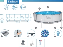 Součástí je filtrační čerpadlo s kartuší typ II, hadice a spony, sítka, záslepky, opravná záplata i bezpečný odnímatelný žebřík.