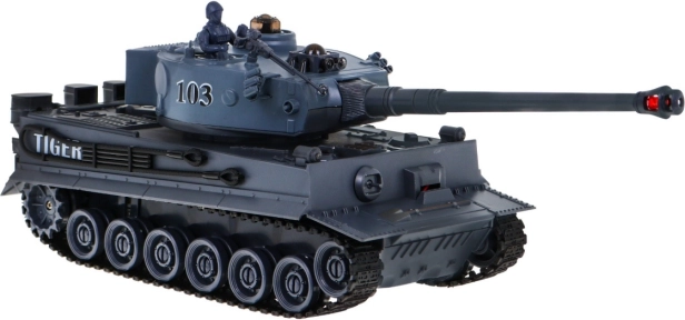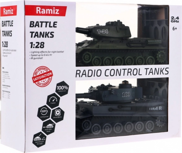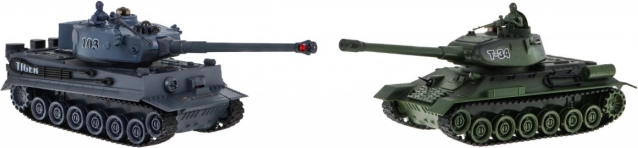 Zažijte velkou tankovou bitvu s dvojicí modelů T‑34 a Tiger v měřítku 1:28. Systém 2.4 GHz umožní souboj více hráčů najednou, IR střelba počítá zásahy a po třech trefách soupeře na 15 s vyřadí. Nechybí otočná věž, světelné a zvukové efekty, pásový podvozek s překonáváním překážek do 3 cm a nabíjecí akumulátory i nabíječky v balení. Vhodné od 3 let.