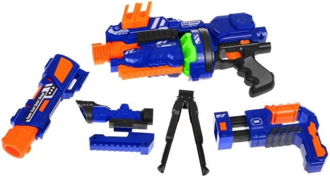 Modulární dětská puška Blaze Storm přináší akční, ale bezpečnou zábavu doma i venku. Elektrický poloautomat s bubnovým mechanismem a zásobníkem umožňuje rychlé jednotlivé výstřely i krátké série, přitom pěnové kuličky jsou měkké a šetrné. Díky celovníku, stabilizátoru a možnosti prodloužení hlavně se děti mohou naučit přesně mířit a vytvářet různé herní scénáře.