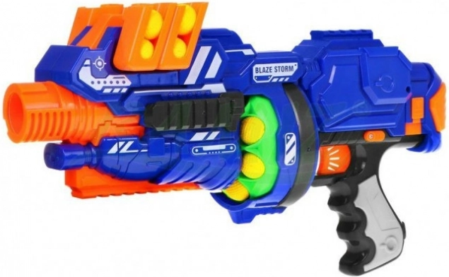 Ergonomická konstrukce s bubnovým zásobníkem na 8 nábojů a úchyty na náhradní zásobníky po stranách hlavně zajišťuje rychlé nabíjení. Pěnové kuličky jsou lehké a měkké, což z nich dělá vhodnou volbu pro dětské bitvy.