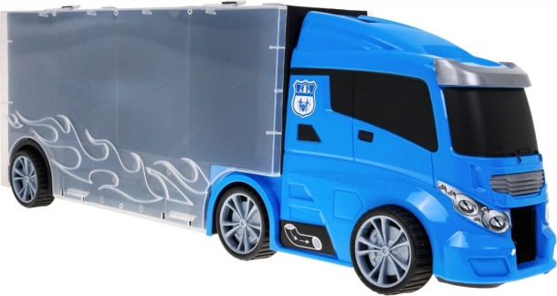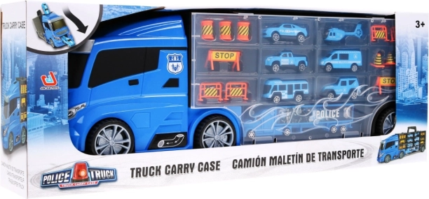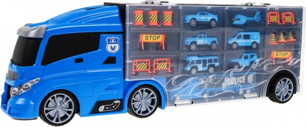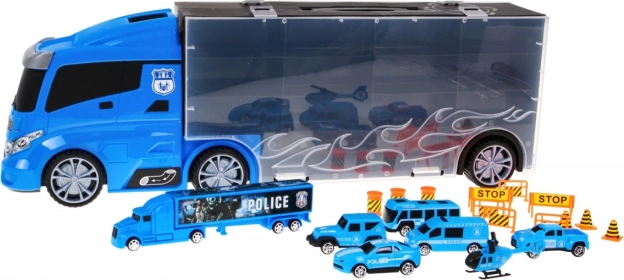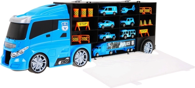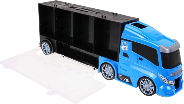 Objevte multifunkční policejní kamion, který slouží jako praktický organizér na resoráky i parádní herní set. Po stranách najdete dva otevíratelné úložné prostory – z jedné strany 13 menších přihrádek, z druhé 5 větších. Nad kabinou je vstup na skluzavku, která vede skrz kabinu a končí vepředu auta. Horní plocha kamionu poslouží jako „letiště“ pro vrtulník. Díky pohodlnému madlu si děti vezmou set kamkoli s sebou.