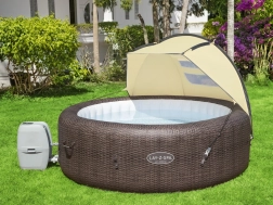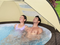 Přístřešek zajišťuje ochranu před UV zářením a větrem, což vám přináší příjemný zážitek z koupele v každém počasí.