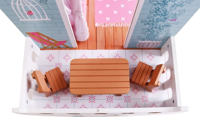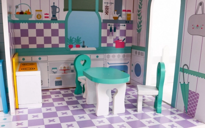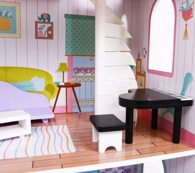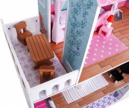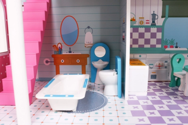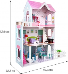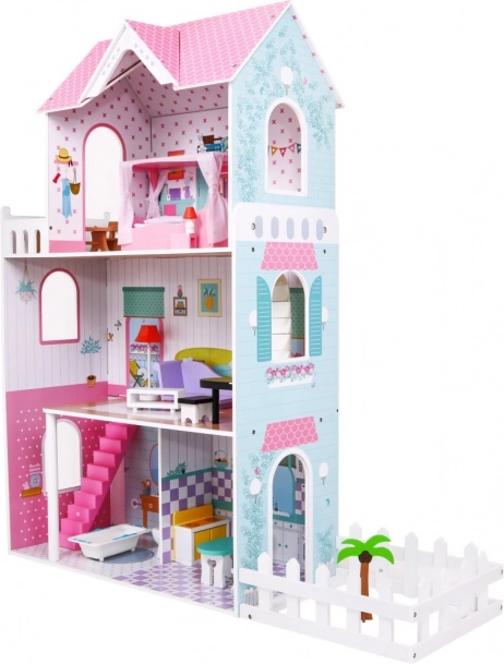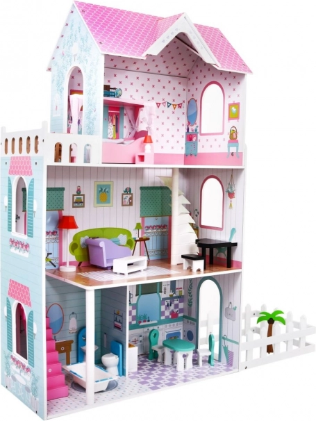 Dřevěný domeček pro panenky představuje ideální herní prostředí pro děti již od 3 let. Vyrobený z odolného dřeva, tento domeček je vybaven bezpečnými, netoxickými barvami, které jej chrání před poškozením. Tři patra plná stylového vybavení, včetně kuchyně, koupelny, obývacího pokoje, ložnice a terasy nabízejí různé herní scénáře.