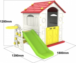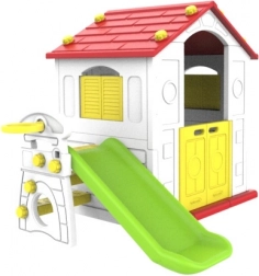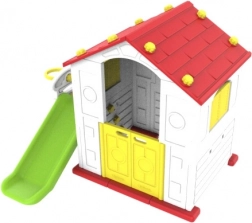 Dětský zahradní domek je ideální místo pro nekonečnou zábavu. S jeho červenou střechou, barvnými detaily a skluzavkou nabízí mnoho možností pro hru a rozvoj dětské fantazie.