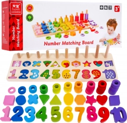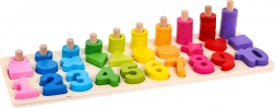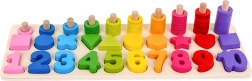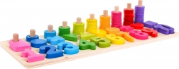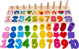 | - čísla od 1-10, - 10 x různé figurky, - 55 x různobarevné kroužky, - dřevěný stojan. |
