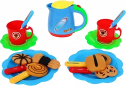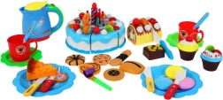 Součástí jsou talířky, hrnečky, příbory, dózičky na sladkosti, čajník i pískací píšťalka – vše v pestrých barvách. Sada je zabalena v barevné dárkové krabici a je ideální jako dárek. Hračka je určena pro děti od 3 let a má certifikaci CE. Napájení: 3× AG3 (součástí balení).