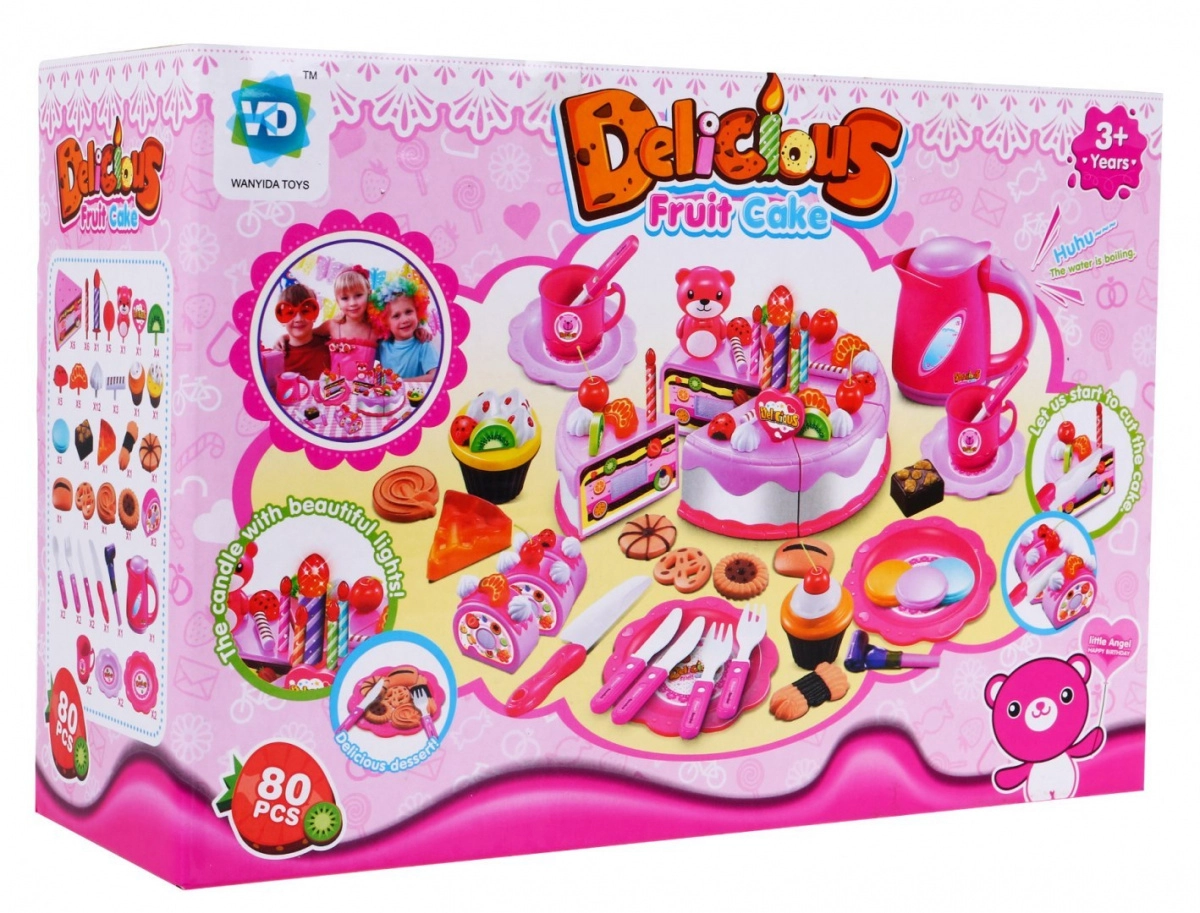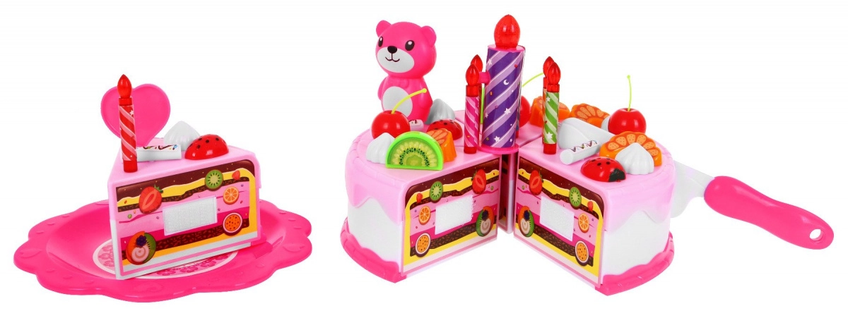 Tato pestrá sada obsahuje vše pro malé cukráře a pořadatele oslav: dort z 6 dílků spojených suchým zipem, který lze bezpečně „krájet“ přiloženým nožem, a desítky dekorací od ovoce až po roztomilého medvídka. Velká svíčka po stisku tlačítka svítí dvěma barvami, čímž dodá oslavě kouzelnou atmosféru.