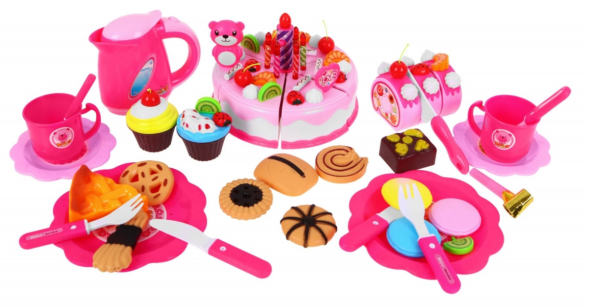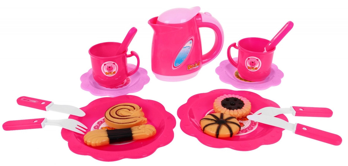 Talířky, příbory, hrnečky, konvička i pestré sladkosti podporují rolovou hru a společné stolování.