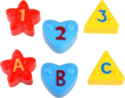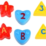 Součástí je 6 pestrých dílků různých tvarů s čísly či písmeny. Děti trénují rozlišování tvarů a barev a zároveň se hravou formou seznamují se základy počítání a abecedy.