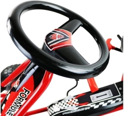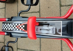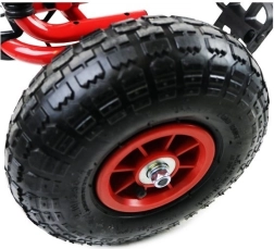Díky nafukovacím širokým kolům s výrazným dezénem zvládne motokára dlažbu, zahradu i parkové cesty. Ruční brzda působící na obě zadní kola dodá jistotu při sjezdech, zatímco zakrytý řetěz a protiskluzové pedály zvyšují bezpečnost. Povrchová úprava kvalitním lakem chrání před poškrábáním a povětrností.