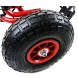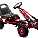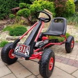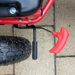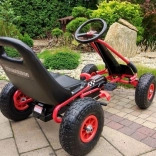 Díky nafukovacím širokým kolům s výrazným dezénem zvládne motokára dlažbu, zahradu i parkové cesty. Ruční brzda působící na obě zadní kola dodá jistotu při sjezdech, zatímco zakrytý řetěz a protiskluzové pedály zvyšují bezpečnost. Povrchová úprava kvalitním lakem chrání před poškrábáním a povětrností.