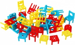 - 36 dílů: 30 židlí různých tvarů a barev, 6 stolků