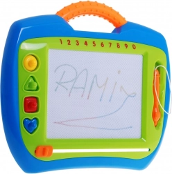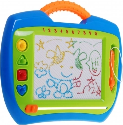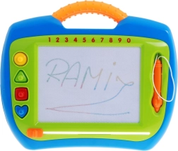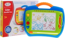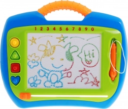 Tato magnetická kreslicí tabulka podporuje kreativitu, jemnou motoriku a soustředění. Plocha pro kreslení má čtyři barevné sektory (žlutý, modrý, červený, zelený), takže obrázky působí živě a děti si přirozeně procvičí rozpoznávání barev a tvarů. Stylus je připevněn na šňůrce, aby se neztratil, a posuvník pod kreslicí plochou vše jedním tahem vymaže.