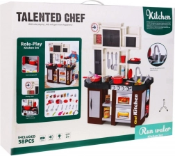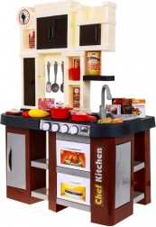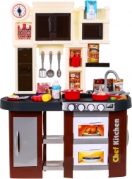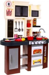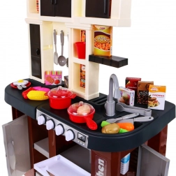 Tato kvalitní dětská kuchyňka v hnědo‑černém provedení přináší dětem realistický zážitek z vaření. Po otočení knoflíků se rozsvítí hořáky a ozvou se autentické zvuky vaření a smažení. Díky kohoutku s tekoucí vodou si malí kuchaři vyzkouší skutečné mytí nádobí a přípravu jídel.