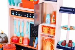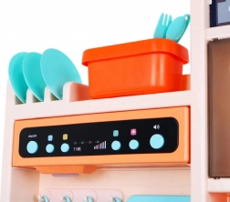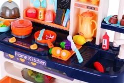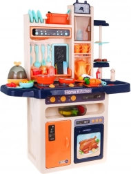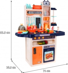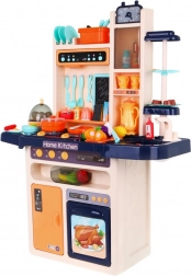 Tato stylová modrá kuchyňka promění hru na vaření v realistický zážitek. Děti si zamilují tekoucí vodu z funkčního kohoutku, podsvícené hořáky s efekty smažení a vaření a jeden hořák s výrobou jemné páry. Nechybí otevírací trouba a lednice, digestoř se světlem a hudební panel, hodiny s pohyblivými ručičkami ani praktické poličky na nádobí.