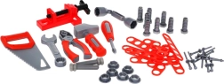 Lehké plastové nástroje se zaoblenými tvary napodobují skutečné nářadí, aby si děti bezpečně procvičily úchop, šroubování a zatloukání.