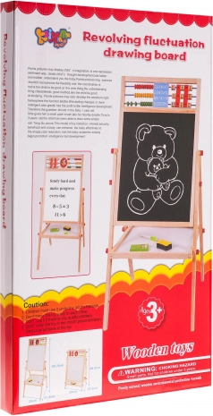 Velká dřevěná, oboustranná tabule pro děti od 3 let nabízí bílou magnetickou whiteboard stranu a černou křídovou tabuli. Nechybí počítadlo, učební hodiny a matematická skládačka, praktická polička a nastavitelná výška. V balení jsou fix s gumou, barevné křídy a houbička – vše pro kreativní psaní, kreslení a učení hrou.