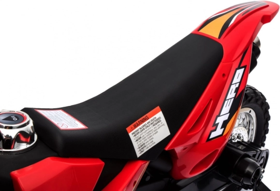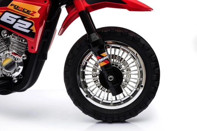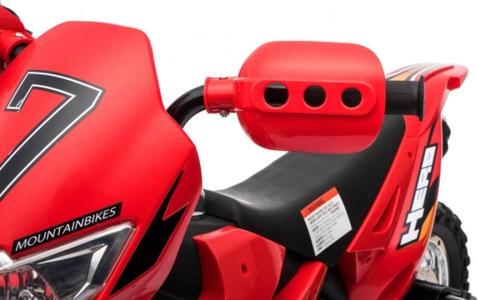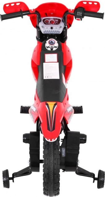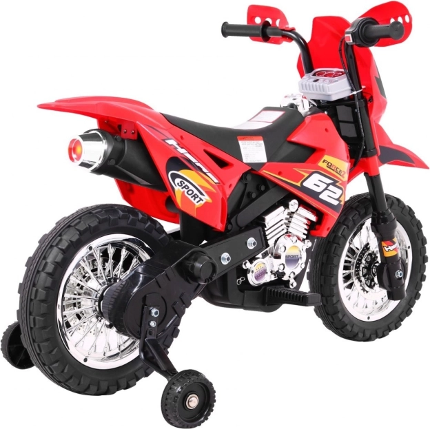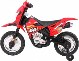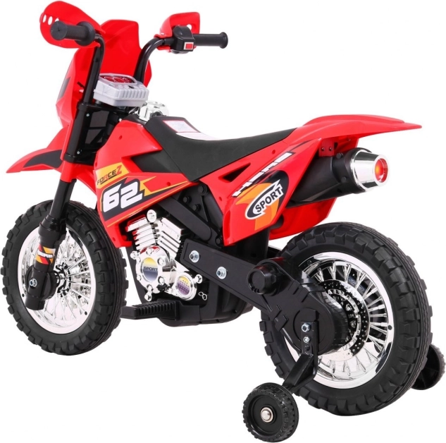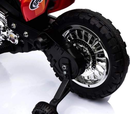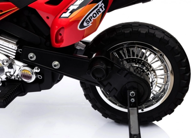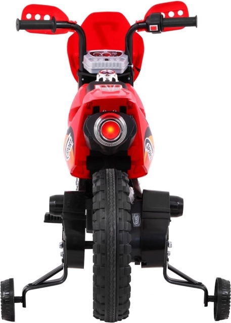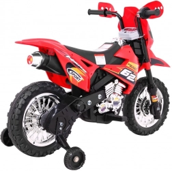 Stylová dětská krosová motorka na akumulátor v zářivé červené barvě nabídne malým jezdcům bezpečnou zábavu doma i venku. Disponuje 6V motorem RS-390, gumovým běhounem kol pro lepší trakci, předním LED světlem a stabilizačními kolečky pro jistotu při prvních jízdách. Intuitivní ovládání plynu v rukojeti a audio panel se zvuky a melodiemi se postarají o realistický zážitek.