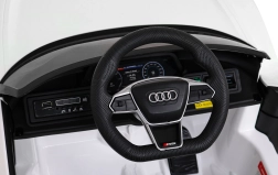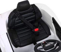 Měkká EVA kola 19 × 7 cm, přední i zadní odpružení a pohodlné sedadlo z eko kůže s bezpečnostními pásy zajišťují pohodlí na různých površích. Realistické LED osvětlení, otevírací dveře a detailní interiér s volantem AUDI umocňují autentičnost.