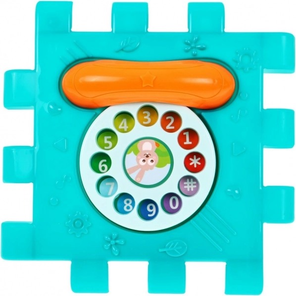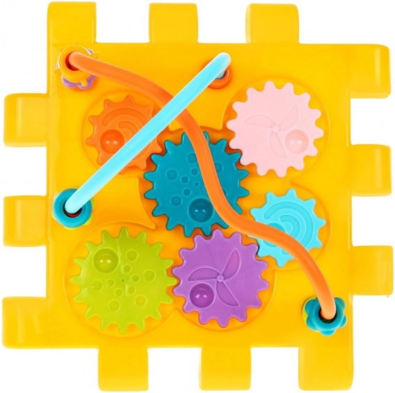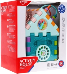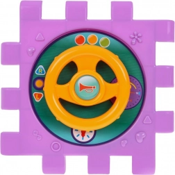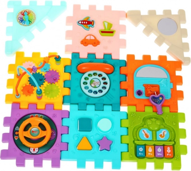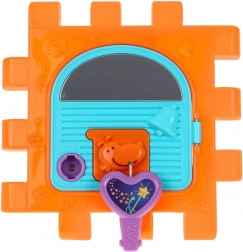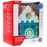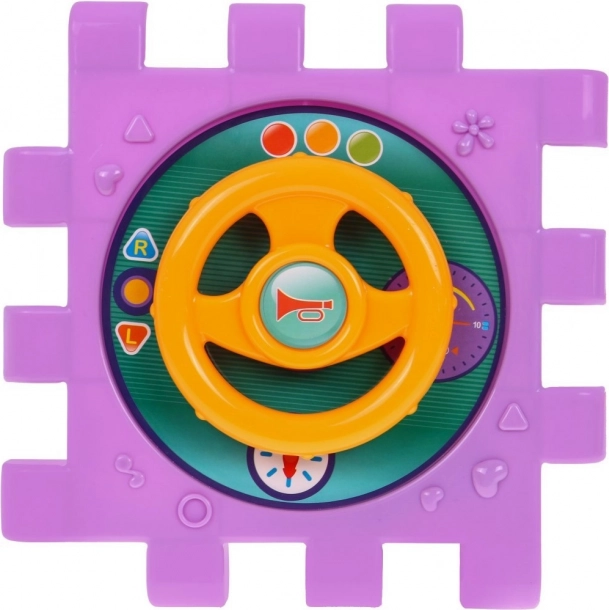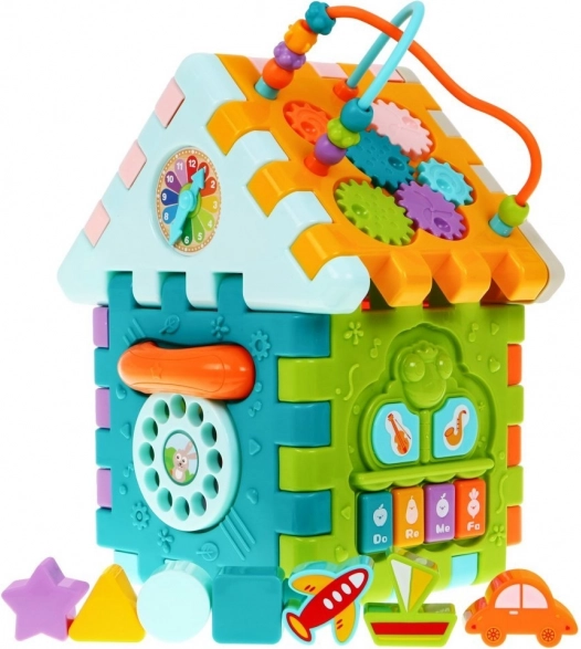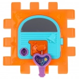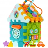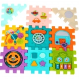 Tento barevný multidomek lze skládat do různých tvarů nebo rozložit na plochou herní podložku. Díky světelným a zvukovým efektům piánka (napájení 3× AAA, nejsou součástí) podporuje rozvoj sluchu a zraku, zatímco mechanické prvky – volant, telefon, dvířka na klíč a ozubená kolečka – skvěle trénují jemnou motoriku a koordinaci.