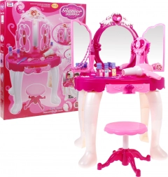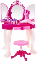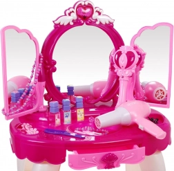 Součástí je stabilní stoleček, pohodlná stolička a bohatá sada doplňků pro líčení a zdobení. Funkční fén na baterie vydává zvuk a jemný vánek, což dodá hře na realističnosti. Set podporuje kreativitu, jemnou motoriku a rolové hry.