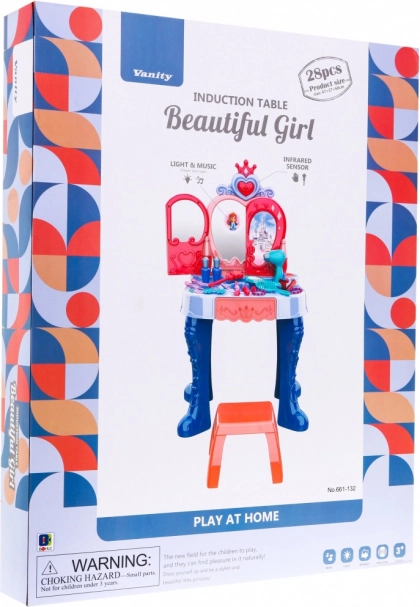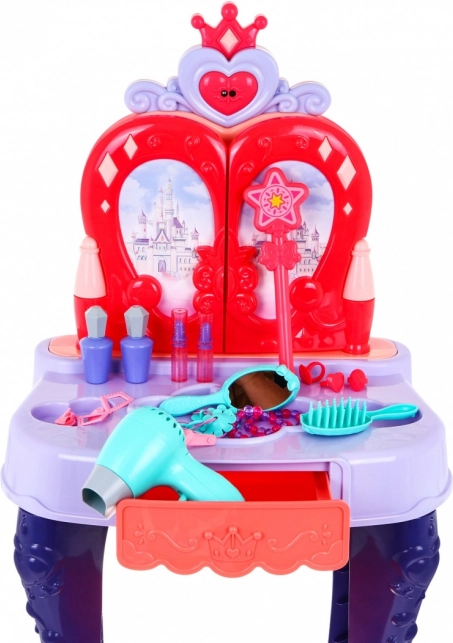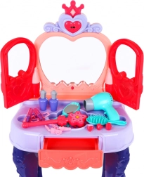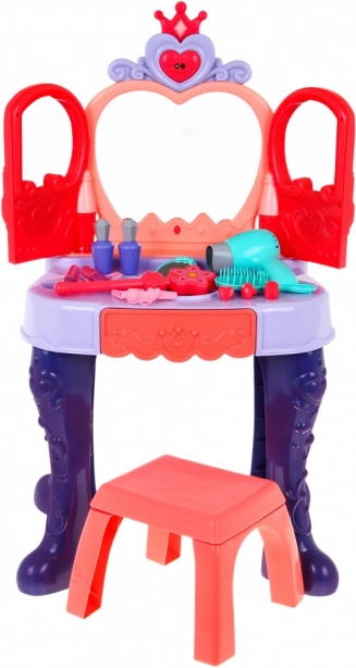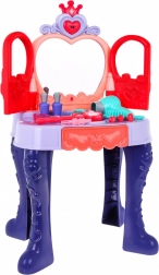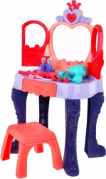Toaletka má praktickou výsuvnou zásuvku na všechny drobnosti a bohaté příslušenství: hřebínek, zrcátko, prstýnky, náramky, sponky, gumičky a atrapy rtěnek a voňavek. Stabilní konstrukce, příjemné rozměry a pohodlná stolička zajišťují komfort při hraní i snadné umístění v dětském pokoji.