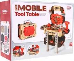 Obsah balení (výběr z 78 ks): kufřík, stojan, vrtačka/šroubovák s výměnnými nástavci, pilka, kladivo, křížový šroubovák, očkoplochý a nastavitelný klíč, dřevěné díly, šroubky, matice, nálepky a další příslušenství.