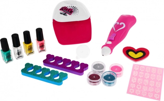 Vše potřebné pro domácí nail art na jednom místě: laky, ozdoby, třpytky, separátory i pilník. Praktická sušička zkracuje čekání a pomáhá fixovat zdobení.
