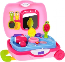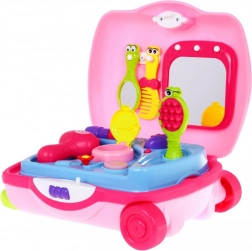 Součástí je velké i malé zrcátko, fén, hřeben, kartáč, „parfém“ a „rtěnka“ (dekorativní atrapy). Po skončení hraní se vše snadno uklidí zpět do kufříku na kolečkách s výsuvnou rukojetí – ideální řešení pro pokoj i cestování.