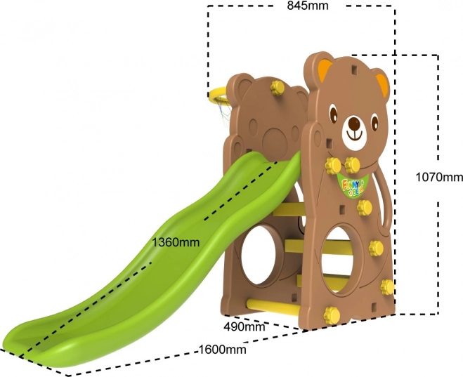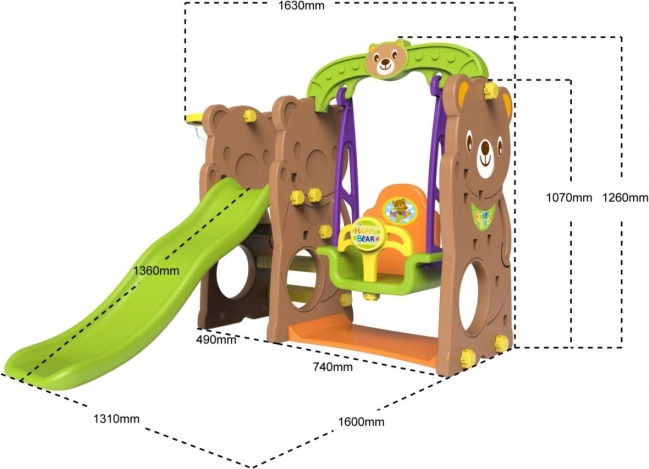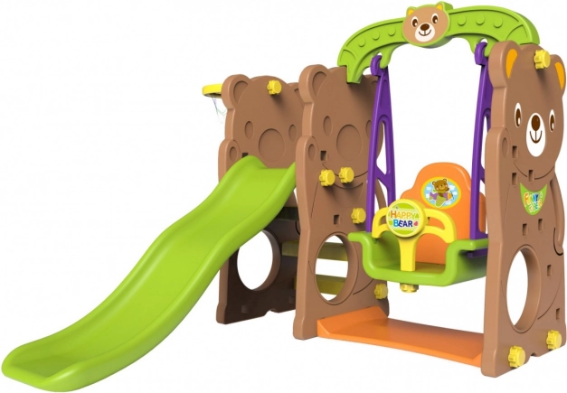 Široká houpačka s vysokým opěradlem a odnímatelnou zábranou, dlouhý hladký skluz a basketbalový koš s míčkem rozvíjí motoriku i koordinaci.