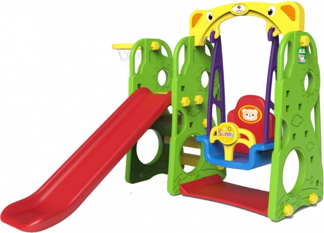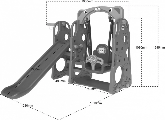 Tato multifunkční dětská herní sestava 3v1 přináší maximální zábavu na malém prostoru. Robustní konstrukce z dvojvrstvého HDPE je pevná, pružná a odolná vůči nárazům, zároveň lehká na montáž. Integrovaný basketbalový koš s míčkem podporuje aktivní hru a koordinaci, houpačka s vysokým opěradlem a odnímatelnou přední zábranou zvyšuje bezpečí i pohodlí.