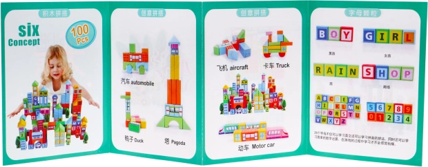 - 100 dřevěných kostek různých tvarů a barev, obrázková inspirační brožura
