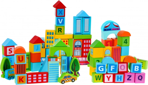 Dřevěné kostky Město 100 ks pro děti 3+. Kvalitní dřevo, bezpečné barvy, hladké hrany. Podporují kreativitu a jemnou motoriku. Skvělý dárek.