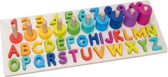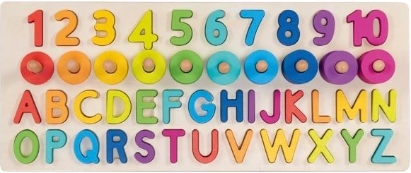 Naše skládačka obsahuje 91 různých prvků, což zahrnuje dřevěnou základnu, písmena (26 ks) a číslice od 1 do 10, a 55 barevných kroužků. Děti tak mohou snadno procvičovat rozpoznávání a sčítání čísel i vytváření jednoduchých slov.