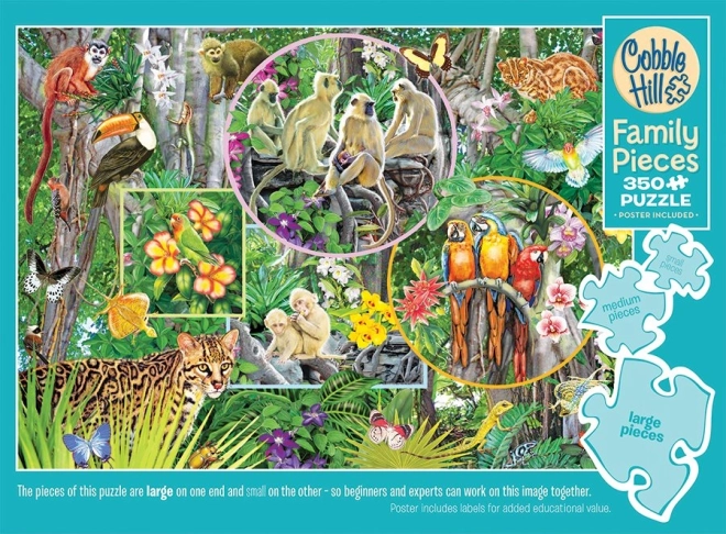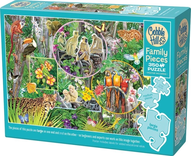 Užijte si společné chvíle s rodinným puzzle COBBLE HILL – Kouzlo pralesa s 350 dílky ve třech velikostech. Díky malým, středním a velkým dílkům si skládání užijí děti, rodiče i prarodiče. Neobvyklé tvary dílků a nesymetrická raznice přinášejí zábavnou výzvu a lepší zážitek ze skládání. Hotový obrázek má rozměr cca 67,6 × 48,9 cm.