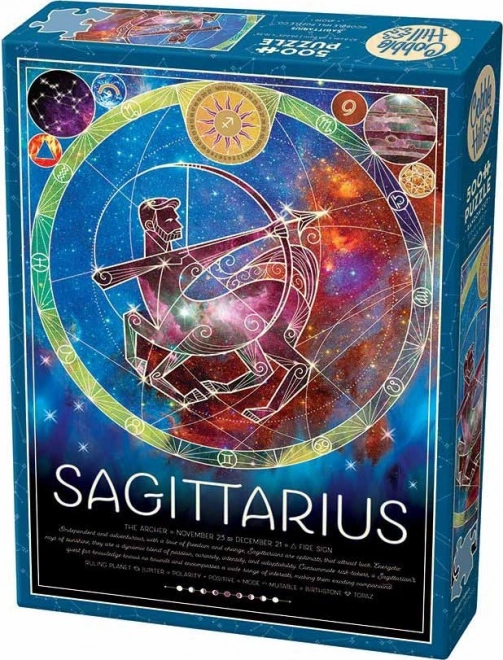 Puzzle COBBLE HILL se odlišují unikátní výrobní raznicí: dílky nemají klasickou mřížku, jejich rohy a hrany nejsou v jedné ose a přicházejí v netradičních tvarech. To přináší zábavnou výzvu všem milovníkům skládání a krásný motivační motiv Střelce z horoskopu dodá dekorativní výsledek po složení.