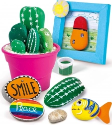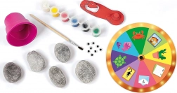 Tato kreativní sada nabízí vše, co děti potřebují k tvoření barevných kamínků – od různě velkých kamenů přes temperové barvy až po nalepovací oči. Součástí je i zábavné kolečko s výzvami, které dětem napoví, jaké motivy zkusit a jak skládat malé kamenné kompozice.